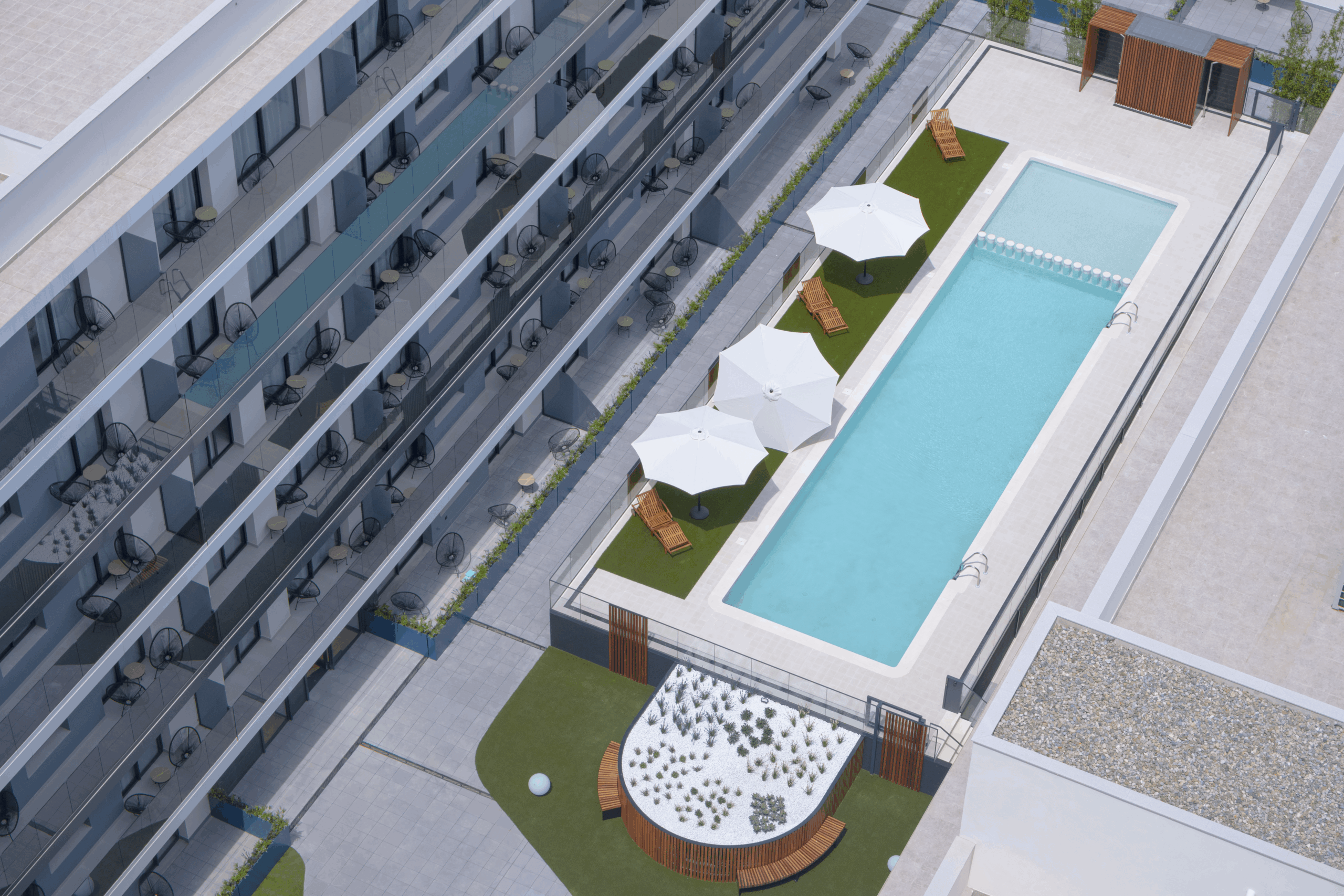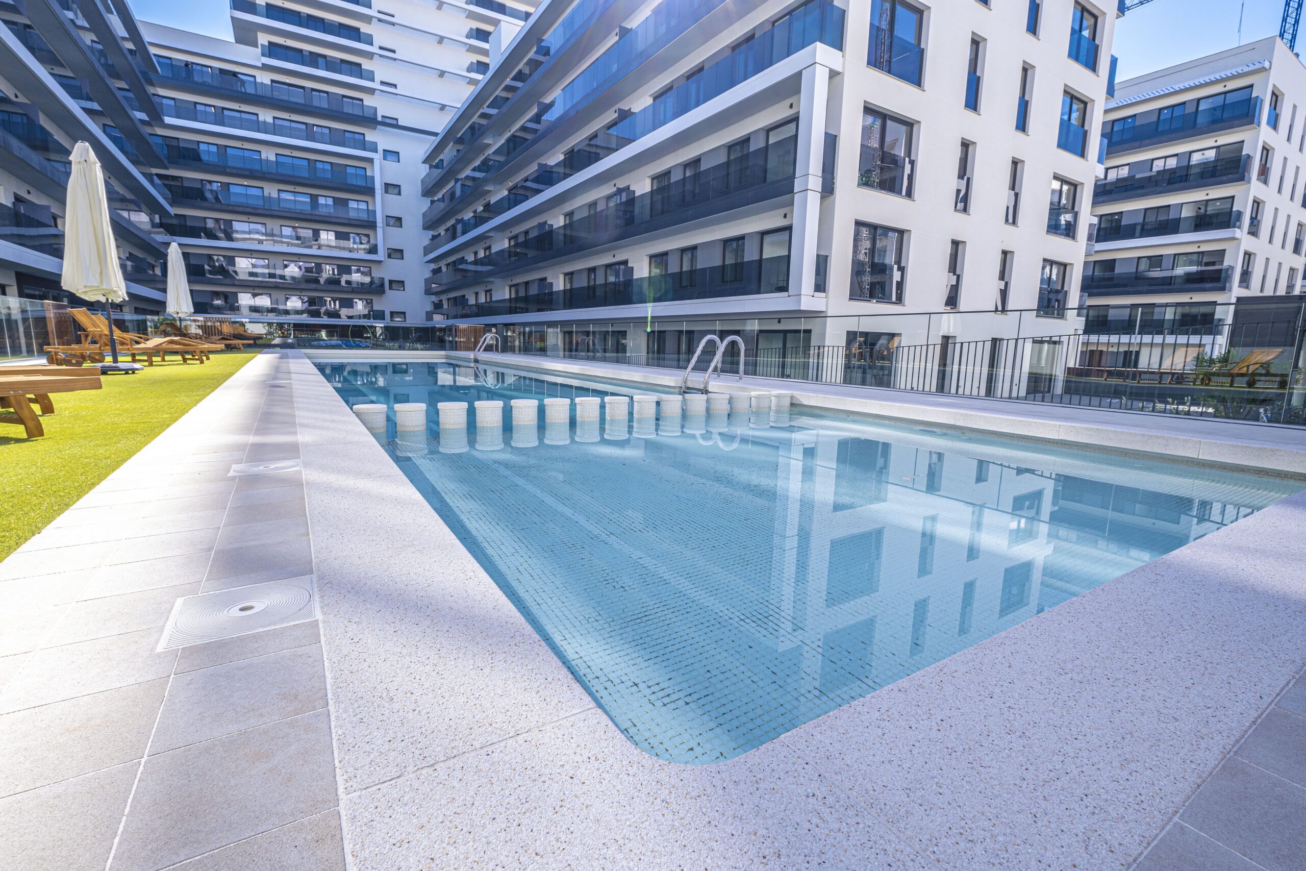 Promoción de pisos: Cobega Barcelona | Promotora Arkspot | Pavimento del contorno de la piscina: Llosa Vulcano® Pool – White | Pavimento del patio interior: Llosa Vulcano® Pool – Metal | Remate de la piscina y escaleras: Wetcast® a medida