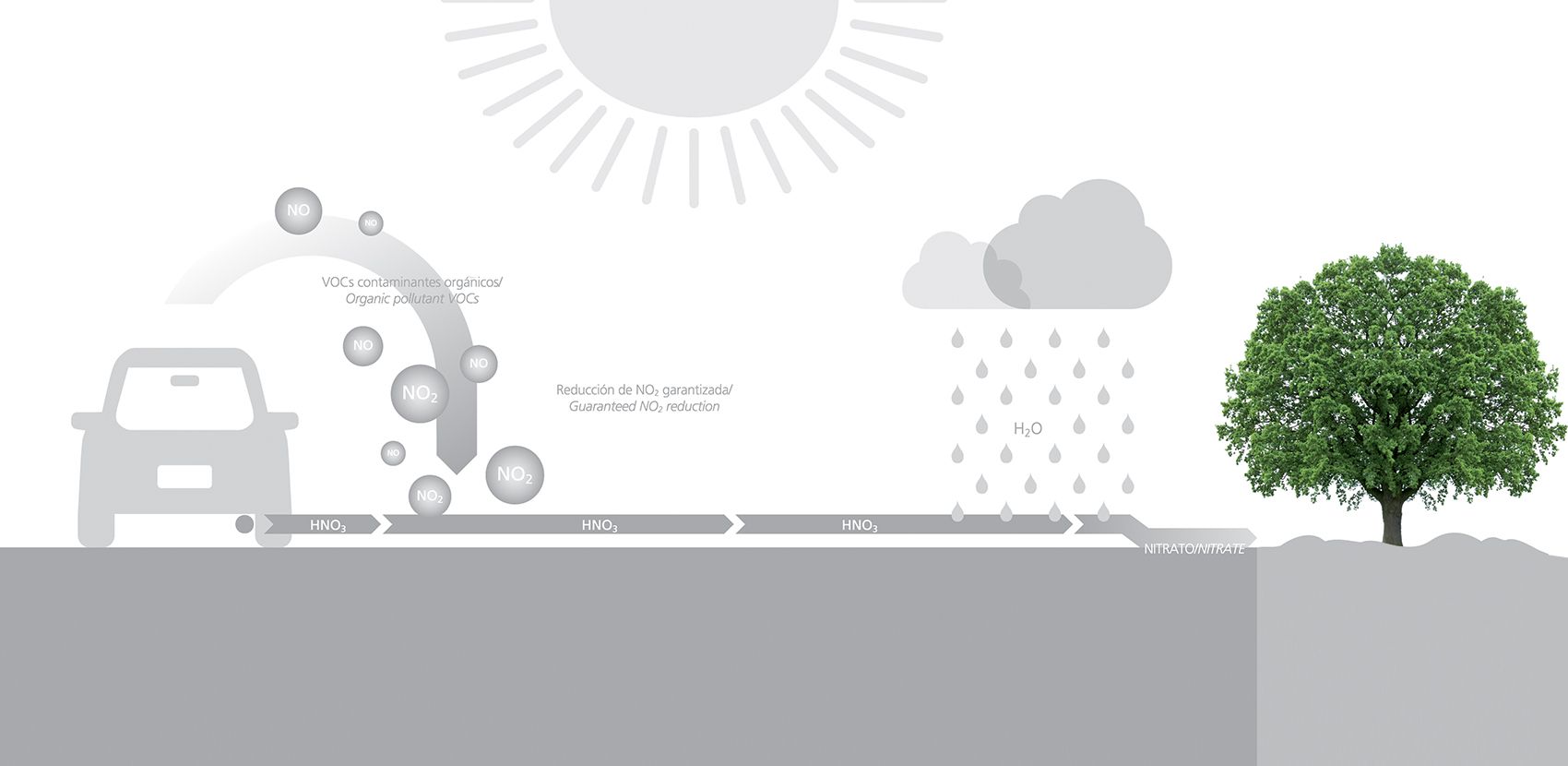La purificación de aire a través de la fotocatálisis se compone de diferentes pasos: bajo la influencia de luz UV, el TiO2 fotoactivo en la superficie del material se activa. Posteriormente, los contaminantes se oxidan debido a la presencia del fotocatalizador y se precipitan sobre la superficie del material. Finalmente pueden ser limpiados de la superficie por la lluvia o por un lavado con agua. La fotocatálisis con dióxido de titanio como catalizador es un campo en rápido desarrollo en ingeniería ambiental, ya que tiene un gran potencial para hacer frente a la creciente contaminación. Además de sus propiedades de autolimpieza, se sabe desde hace casi 100 años que el dióxido de titanio, actúa como un foto-catalizador que puede descomponer contaminantes bajo radiación UV. (4) El impulso para el uso más extendido de los materiales fotocatalíticos TiO2, fué en 1972 cuando Fujishima y Honda (5), descubrieron la hidrólisis del agua en presencia de la luz, por medio de un ánodo de TiO2 en una celda fotoquímica. En la década de 1980, la contaminación orgánica en el agua también se descompuso mediante la adición de TiO2 y bajo la influencia de la luz UV.(6) La aplicación de TiO2, en la fase cristalina anatasa foto-activa, como material de purificación de aire se originó en Japón en el año 1996.(7) Desde entonces, un amplio espectro de productos aparecieron en el mercado para uso en interiores, así como para aplicaciones en exteriores. En cuanto a las emisiones del tráfico, es importante que los gases de escape permanecen en contacto con la superficie activa durante un cierto período. La configuración de la calle, la velocidad del tráfico, la velocidad y dirección del viento, todos influyen en la tasa de reducción final de los contaminantes in situ.